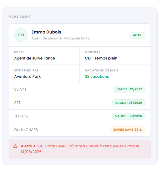 Fini de chercher dans trois fichiers Excel différents, dans une boîte mail ou dans un classeur physique. La gestion des agents de sécurité privée commence par une information fiable, centralisée et toujours à jour.